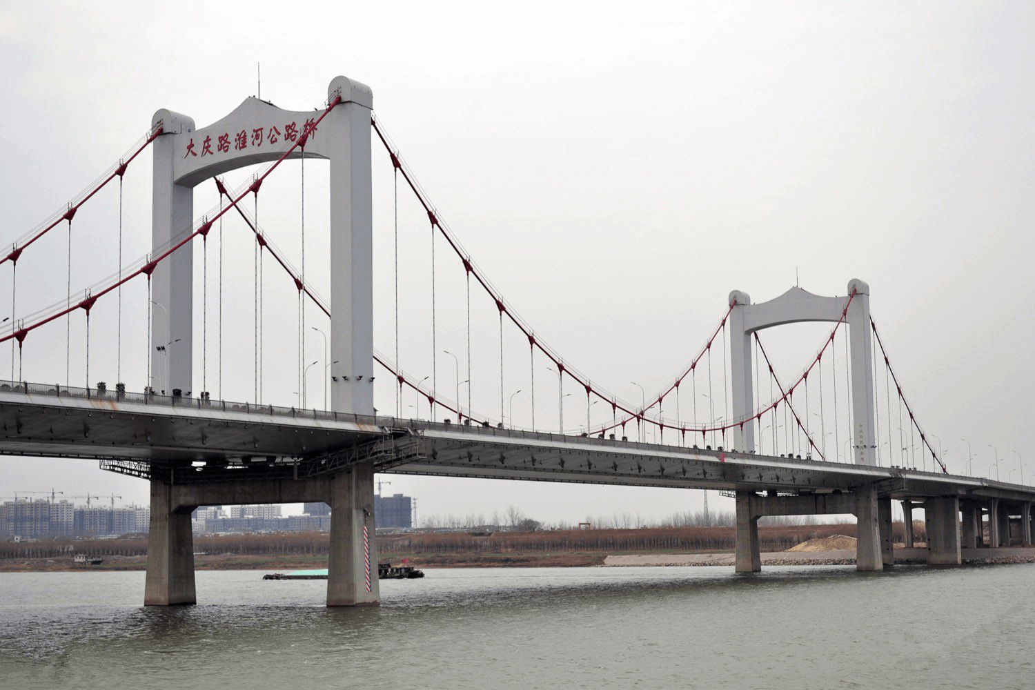 蚌埠市大慶路淮河公路橋于2009年12月開建,工期為3年,是蚌埠第三座淮河大橋,工程投資總概算達(dá)6.87億元。全線將設(shè)互通立交一處,采用雙向六車道設(shè)計(jì),并設(shè)置非機(jī)動(dòng)車道和人行道,設(shè)計(jì)速度60公里/小時(shí)。主橋采用雙塔雙索面自錨式懸鎖結(jié)構(gòu),路橋全長(zhǎng)2.38公里,其中主橋長(zhǎng)1778米,兩端接線602米,南岸設(shè)有四層八向互通立交,是淮河上第一座自錨式懸鎖橋。